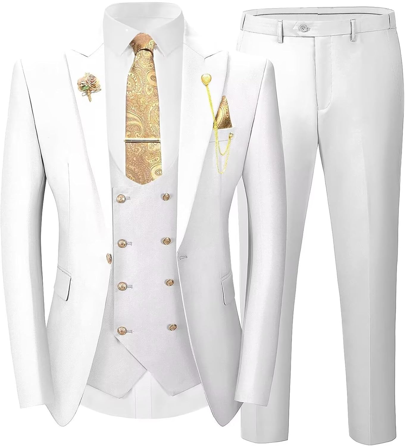 Stylish design:The suit jacket uses the classic peak lapel,one button suit blazer,flap pocket. Double breasted suit vest. Adjustable waist suit Pants. Formal Slim fit Blazer Jacket Vest Pant.
