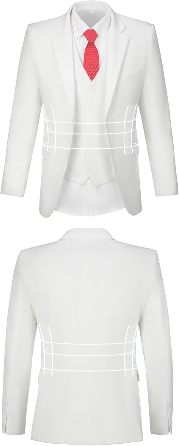 Package includes:Jacket + Pants+vest+tie,4-Piece Suit,There may be a slight color different between the photo and the finished suit. Hope you can understand this.