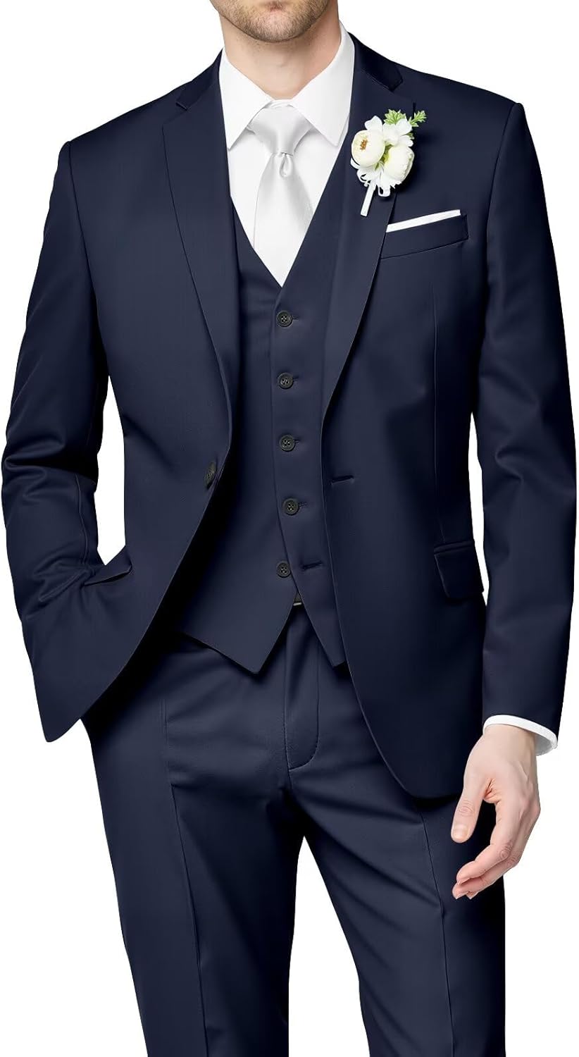 【SUIT FEATURES】Jacket: Single breasted/One button/Notch lapel/Flap Pockets; Pants: Flat front/ Expandable waist; Vest: Single breasted/5 buttons/Adjustable back. We use high quality polyester blend fabric for this wedding suit for men: Healthy, soft, comfortable, breathable, and easier to wash. With experienced tailors, a high-quality and well-cut suit can instantly make a man confident, powerful and charming.