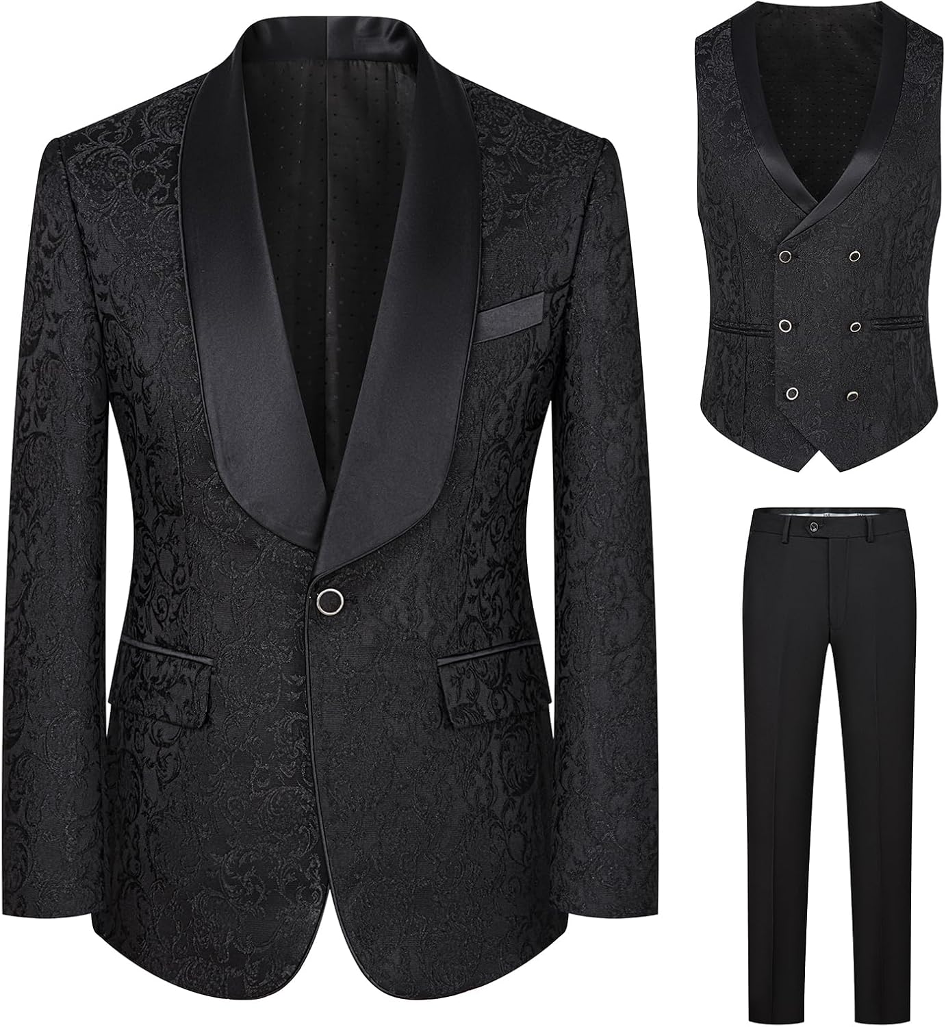 【Paisley Jacket Vest Pants Suit】The single-breasted one button blazer is feature with regular fit, a satin shawl lapel, one front pocket,two side pockets and inside pockets, allover classy paisley embroidered pattern makes it a head turner.V-neck double breasted vest and pants, classic color scheme, elegant and mature, never outdated.